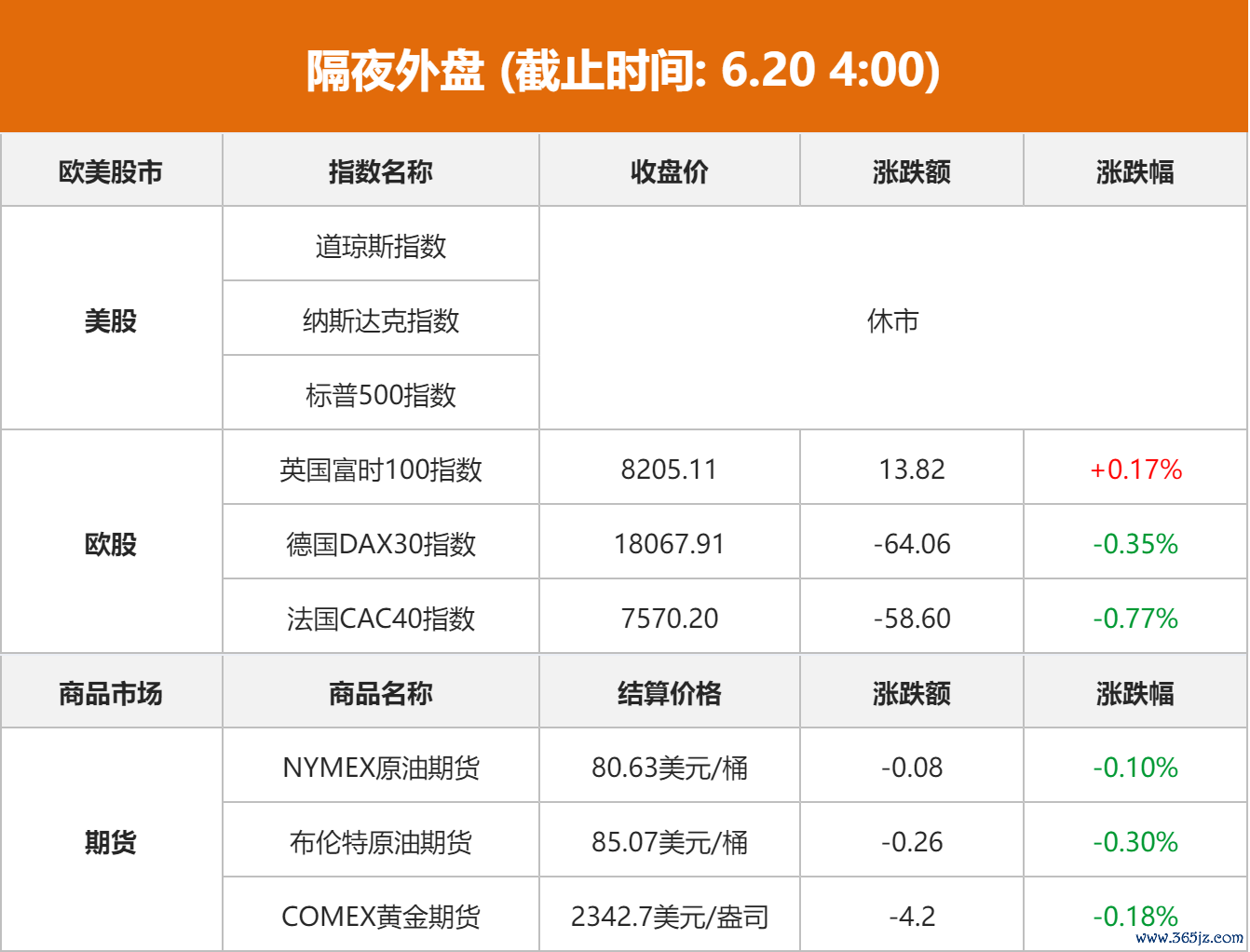 美股:美股因节日休市一日,美东时间6月20日(周四)恢复正常交易。 欧股:欧洲三大股指当天涨跌不一,英国伦敦股市《金融时报》100种股票平均价格指数19日报收于8205.11点,比前一交易日上涨13.82点,涨幅为0.17%。法国巴黎股市CAC40指数报收于7570.20点,比前一交易日下跌58.60点,跌幅为0.77%;德国法兰克福股市DAX指数报收于18067.91点,比前一交易日下跌64.06点,跌幅为0.35%。 亚太股市:6月19日,香港恒生指数收涨2.87%,报18430.39点;恒生科技指数收涨3.65%,报3832.32点。日经225指数收涨0.23%,报38570.76点。韩国KOSPI指数收涨1.20%,报2797.04点。